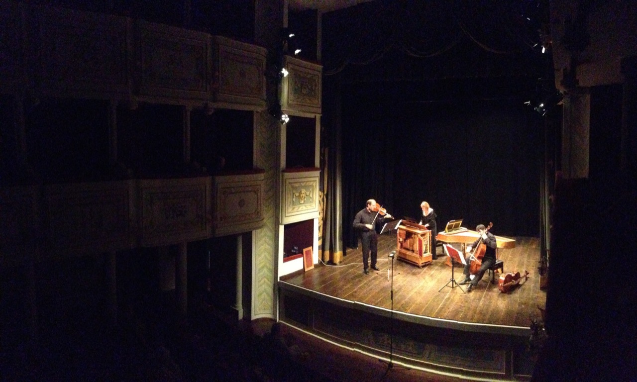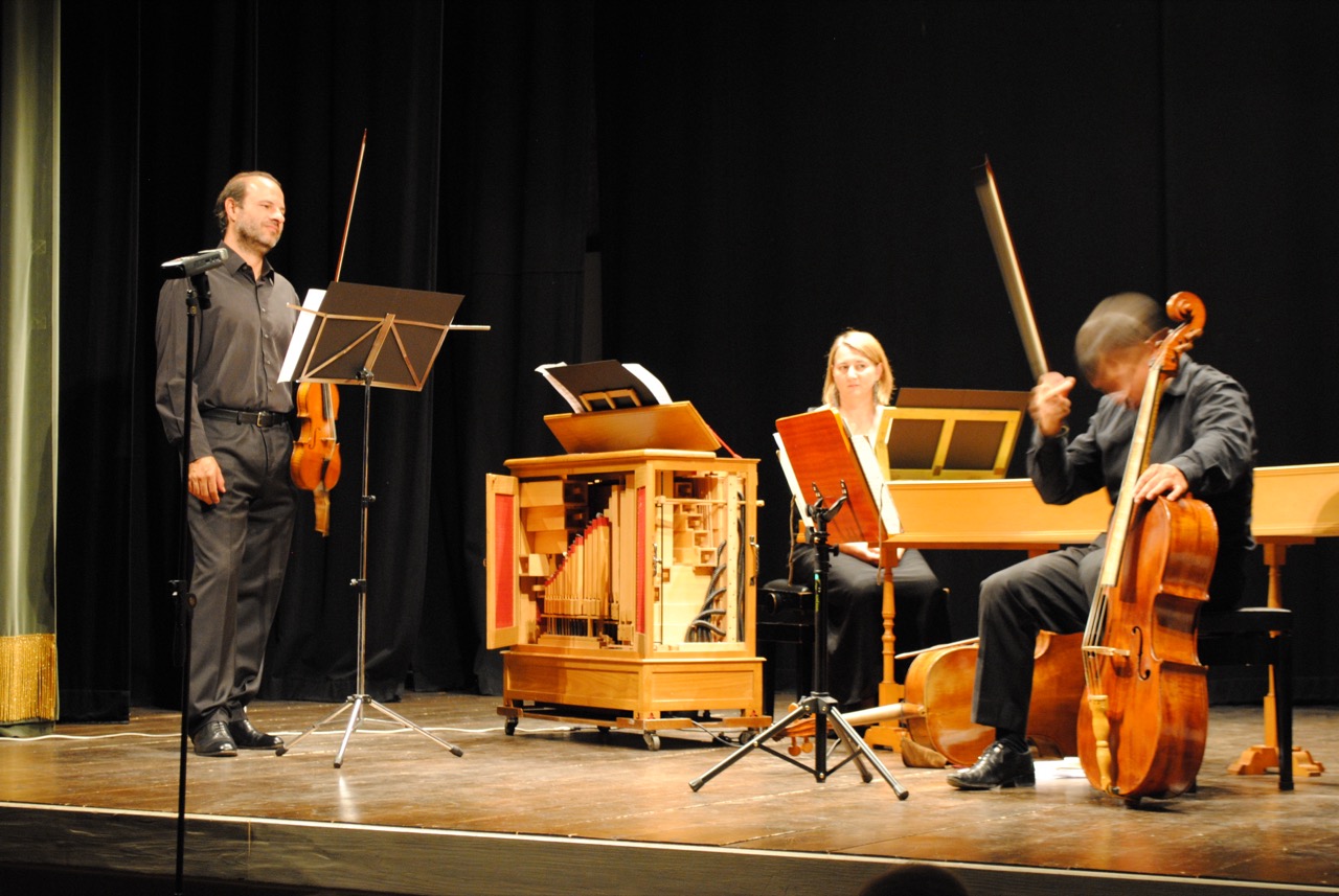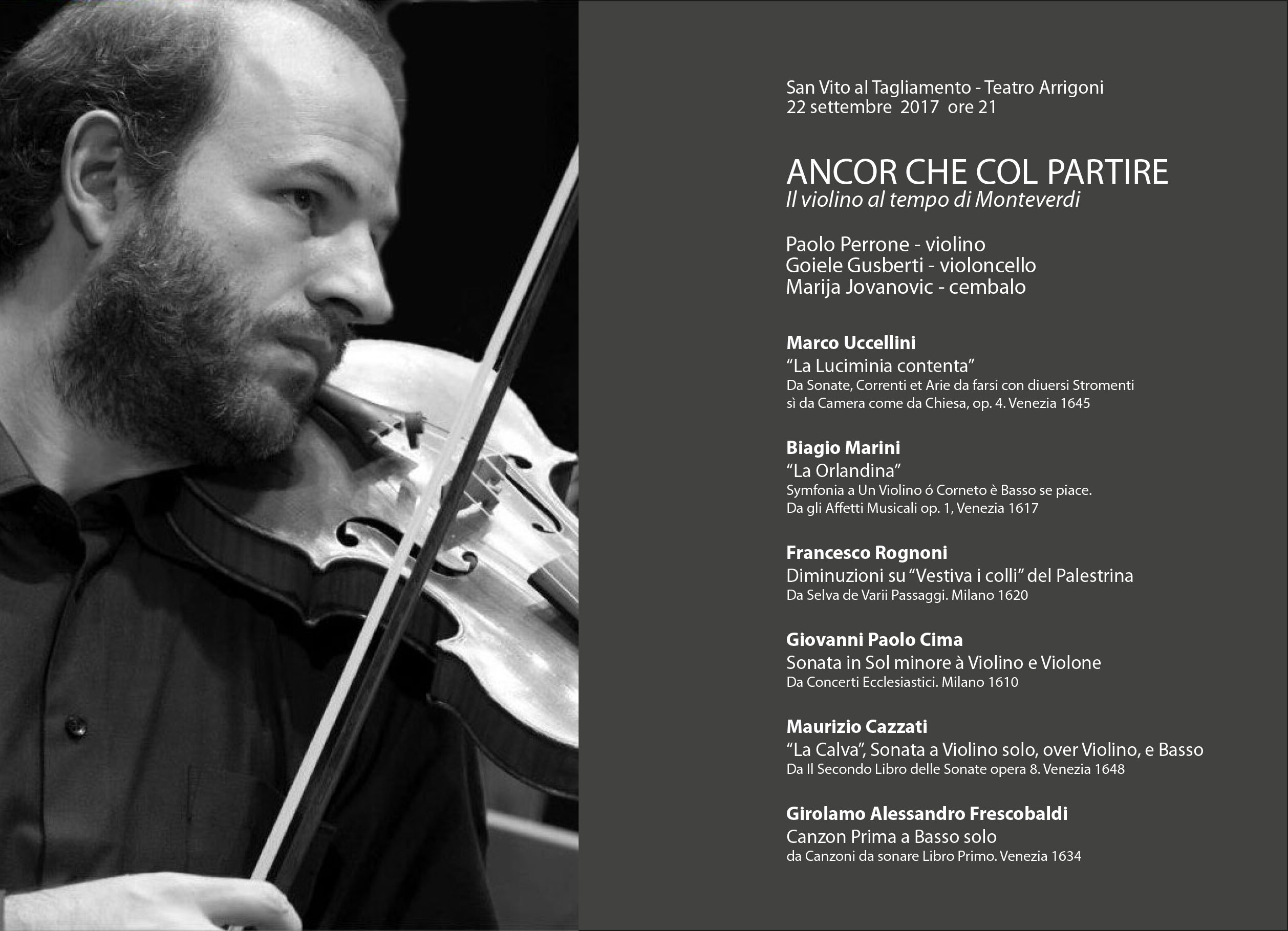 Marco Uccellini “La Luciminia contenta” Da Sonate, Correnti et Arie da farsi con diuersi Stromenti sì da Camera come da Chiesa, op. 4. Venezia 1645 Biagio Marini “La Orlandina” Symfonia a Un Violino ó Corneto è Basso se piace. Da gli Aetti Musicali op. 1, Venezia 1617 Francesco Rognoni Diminuzioni su “Vestiva i colli” del Palestrina Da Selva de Varii Passaggi. Milano 1620 Giovanni Paolo Cima Sonata in Sol minore à Violino e Violone Da Concerti Ecclesiastici. Milano 1610 Maurizio Cazzati “La Calva”, Sonata a Violino solo, over Violino, e Basso Da Il Secondo Libro delle Sonate opera 8. Venezia 1648 Girolamo Alessandro Frescobaldi Canzon Prima a Basso solo da Canzoni da sonare Libro Primo. Venezia 1634 Tarquinio Merula “La Maruta”, Canzon a 2, Violino e Violone. Da Canzoni ovvero Sonate Concertate per Chiesa e Camera. Libro III op. XII. Venezia 1637. Giovanni Battista Spadi Diminuzioni su “Ancor che co'l partire” di Cipriano di Rore. Da Libro de’ Passaggi Ascendenti e Discendenti. Venezia 1624 Dario Castello Sonata Seconda Da Sonate concertate in stil moderno, Libro Secondo. Venezia 1629 Girolamo Frescobaldi Canzon Quinta a Alto e Basso da Canzoni da sonare Libro Primo. Venezia 1634 Marin Marais Sonnerie de Sainte Genevieve du Mont de Paris. Da La gamme et autres morceaux de simphonie pour le violon, la viole et le clavecin. Parigi 1723 Paolo Perrone, violino barocco Gioele Gusberti, violoncello Marija Jovanovic, cembalo e organo