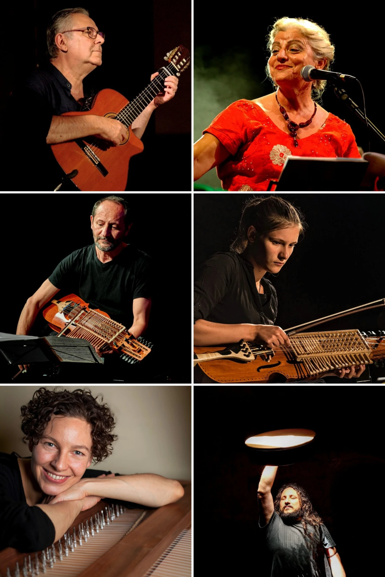 Luigi Bolognese Nel 1978 fonda con Maria Moramarco e Silvio Teot il gruppo Uaragniaun con il quale incide 13 lavori discografici. In oltre quarant’anni di attività ha suonato con il gruppo Uaragniaun in centinaia di concerti in Italia e all’estero. Nel corso di questi anni approfondisce l’uso degli strumenti tipici dell’area mediterranea studiando i seguenti strumenti: baglama , bouzuoki e mandoloncello. Dal 2001 è direttore artistico della rassegna internazionale di world music Suoni della Murgia. Marco Ambrosini Nato a Forlì nel 1964 è conosciuto in Europa continentale come il pioniere della nickelharpa, una viola d’amore a chiavi, in uso anche in Italia sia dal Medioevo ma in tempi moderni simbolo della musica tradizionale svedese. Originariamente violinista classico, si è dedicato alla viola a chiavi sin dagli anni Ottanta e si esibisce con questo strumento nei teatri più prestigiosi, come la Scala di Milano, la Carnegie Hall di New York, la Filarmonica di Berlino , vantando collaborazioni con la Filarmonica di Mosca. Negli ultimi anni ha preso parte a numerose produzioni radiofoniche e televisive e a registrazioni come solista, compositore o membro di numerosi ensemble di musica antica e di musica d'avanguardia. Angela Ambrosini Nata nel 2000 a Eifa, nei pressi della città tedesca di Hatzfeld, suona nyckelharpa sin da giovanissima. Negli ultimi anni ha eseguito numerosi concerti in vari paesi europei suonando in ensemble di fama internazionale, come Oni Wytars, la Capella Antiqua Bambergiensis, Ensemble Triskilian (Germania), il coro Vox Clamantis e la Filarmonica di Tallinn (Estonia), con il sestetto italiano Festa Italiana di Lucilla Galeazzi e con l’ensemble italo-argentino La Chimera. Eva-Maria Rusche Nata nel 1982 nella città tedesca di Tubinga, ha studiato musica sacra, organo e strumenti storici a tastiera a Lubecca, Vienna e Stoccarda con Michael Radulescu, Jürgen Essl, Arvid Gast, Franz Danksagmüller, Hans-Jürgen Schnoor e Jon Laukvik. Ha partecipato a numerosi corsi di perfezionamento e ha insegna-to clavicembalo all’Università Musikhoch Schule di Stoccarda. Attualmente vive a Costanza come musicista freelance e insegnante di musica. È attiva come solista e membro di formazioni internazionali come l’Ensemble Supersonus, OniWytars o il Konstanzer Kammerchor, con i quali si esibisce al clavicembalo, piano, organo e fortepiano. Francesco Savoretti La ricerca continua delle sonorità e l’attenzione verso le dinamiche esecutive sono gli aspetti più rilevanti che contraddistinguono il suo stile. La robustezza del drive accompagnata sapientemente dai “sapori” della personalissima ricerca timbrica gli vale la definizione di “Cuoco della Musica”. È così che la buona esecuzione e dimestichezza con le tecniche dei tamburi a cornice sono esaltate dal suo personale percorso verso una originale ricerca sonora. Questa sua peculiarità lo porta spesso a lavorare con set multipercussivi e ad esplorare generi musicali diversi: world music, contemporanea, ethno jazz, early music.